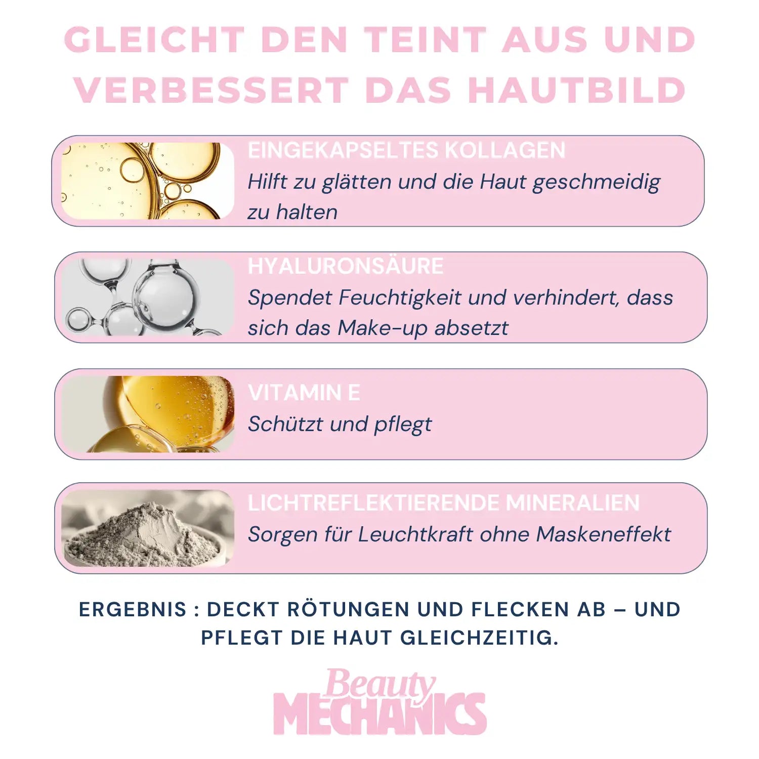 - Selbstanpassende Pigmenttechnologie (passt den Farbton an die Haut an)